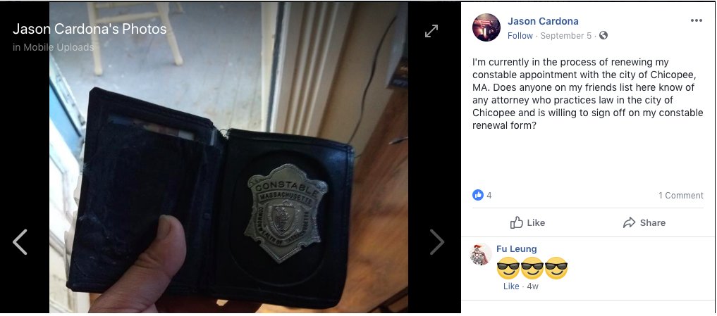 4.) He's also trying to renew his constable appointment. He's not currently listed in the constable database, but you can contact the Chicopee Constables here to warn them about him: https://constable.com/index.php/contact-us/ …pic.twitter.com/tUxCgKlSVa