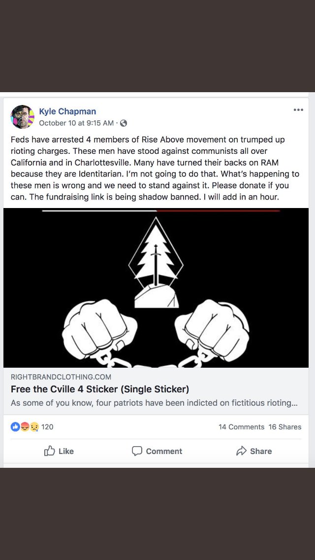 Reminder that Kyle Chapman, head of now-defunct Proud Boys street-fighting wing the Fraternal Order of Alt-Knights, was supporting the white nationalist RAM last week. Why? Because RAM members were just indicted on federal charges relating to 2017 violence in Charlottesville.pic.twitter.com/Q4JdwjWeBg