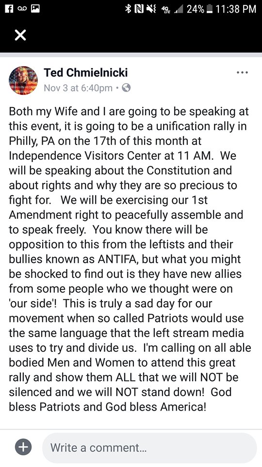 9/ Ted & Kristyna came from NC to speak at the Nov17 rally in Philly. Not content to hobnob with the dumbest far-right figures the region has to offer, the event's leaked "security" chat shows that Ted was acting as a liaison to bring Patriot Prayer's Joey Gibson to the party.pic.twitter.com/gBbphAPxtG