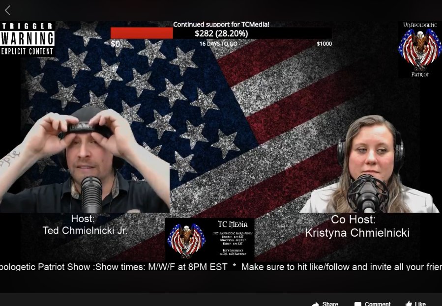 4/ Though relatively new to the boring world of reactionary FB livestreams, Ted is DEDICATED, producing his "Unapologetic Patriot" show three times a week and a slightly drunker version called "Ted's Insomniacs" each Saturday night.pic.twitter.com/tjeloG72Iw
