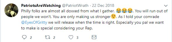 19/ Despite talking a big game, the output of @Patriotwrath has been lacking-- mostly inaccurate Whitepages info of random people who disagree with them on Twitter, and recycled (uncredited) doxxes from self-described fascist Jack Corbin. https://bit.ly/2F7SKOD pic.twitter.com/3K1XjrLG2f