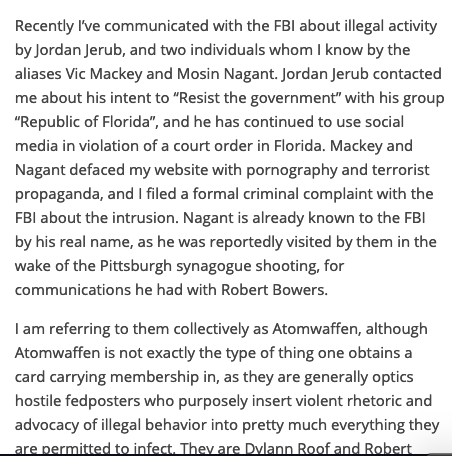 What’s spectacular about this is that neither Jereb nor “Vic Mackey” nor “Mosin Nagant” are part of Atomwaffen nor do their behaviors match the MO of that group. He’s literally just making stuff up.https://twitter.com/AntiFashGordon/status/1096909119339024384 …