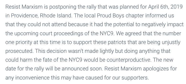 Looks like Resist Marxism got scared and postponed their rally until, uhhhhhh...... whenever Proud Boys tell them it's okay to have another rally. But, uh, they're not a front for a violent hate group or anything. They just do whatever the Proud Boys tell them. 🤣pic.twitter.com/DGPIVGGhfS