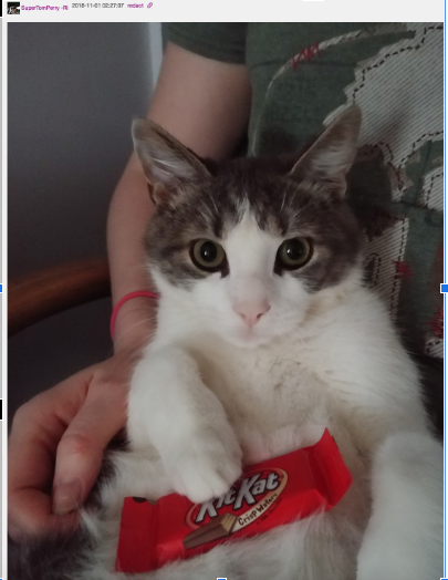 13/ And he offers his fellow white nationalists a cute picture of his cat with a Kit-Kat bar. It's the same photo posted to the Instagram account of Meia Farrea, where she notes, "Busted!" Busted indeed, "SuperTomPerry," aka Stephen Thomas Farrea, of Portsmouth, Rhode Island.pic.twitter.com/x6fxeaPYNJ