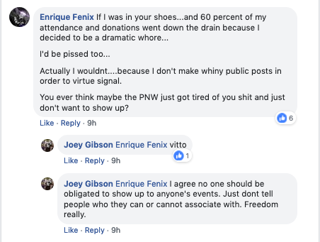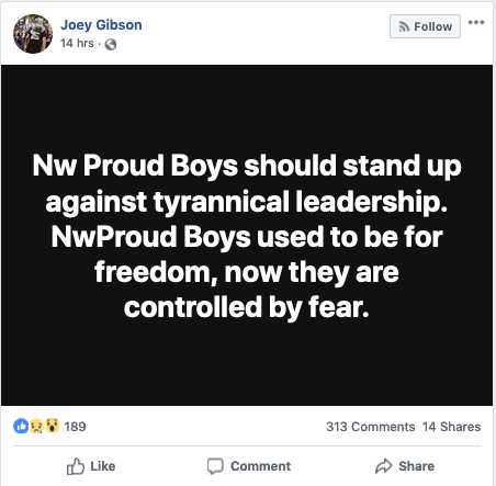 1/ Joey Gibson is currently telling Proud Boys to revolt against Chairman Enrique Tarrio. It's, uhhhhh, not going real well. He's catching threats, and Haley just told Chris Ponte to "eat my ass."pic.twitter.com/j6flB4a8gH
