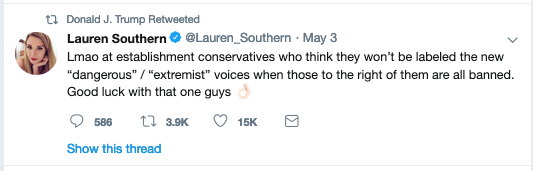 Donald Trump is now promoting Lauren Southern, a white nationalist. In 2017, Southern produced a YouTube video entitled, "The Great Replacement," promoting the "white genocide" conspiracy theory. In 2019, the same title was used by the Christchurch shooter for his manifesto.pic.twitter.com/vNUkXJd8G7