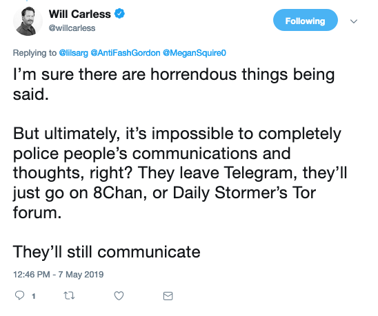 and just fyi, @willcarless, now's a really good time to reevaluate your support for fascists like Loomer having access to platforms like @telegram, where they can call for the harassment of the families of journalists for doing their jobs