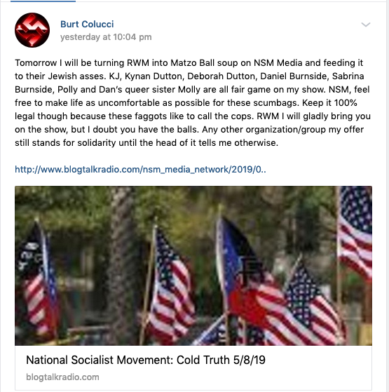 After announcing that he'd purged his VK page of comments disparaging other white nationalists on May 6, National Socialist Movement leader Burt Colluci went almost 27 hours before attacking fellow white nationalist Kynan Dutton. 🤣pic.twitter.com/K3vAJ8SnY2