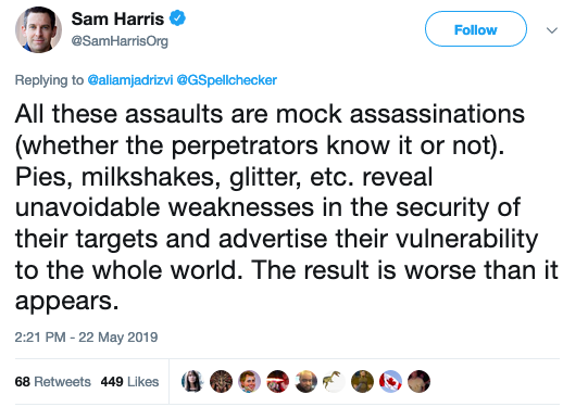 Both Proud Boys founder Gavin McInnes and Sam Harris claim that throwing milkshakes at fascists is a rehearsal for assassinations. This is bad faith argument meant to encourage state crackdowns on protesters-- literally the opposite of the "free speech" they claim to champion.pic.twitter.com/pETZEybmLZ