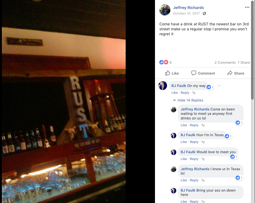 14/ The media's ignored this connection, but Richards is a former employee of rust, and likely a member of Biro's crew. Here's Richards posing with Biro at Rust, Richards advertising the bar on his Facebook page, and interacting with Todd Biro on Facebook.pic.twitter.com/btn84l0RdE