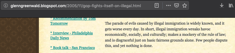 This is Greenwald in 2005, but you could drop it into a Patriot Front chat today, and it would play just fine. He's ascribing a literally supernatural harm-- "evil"-- to illegal immigration, at a time when the GOP was trying to court Latino voters, including undocumented folks.pic.twitter.com/EAFP04lpRX