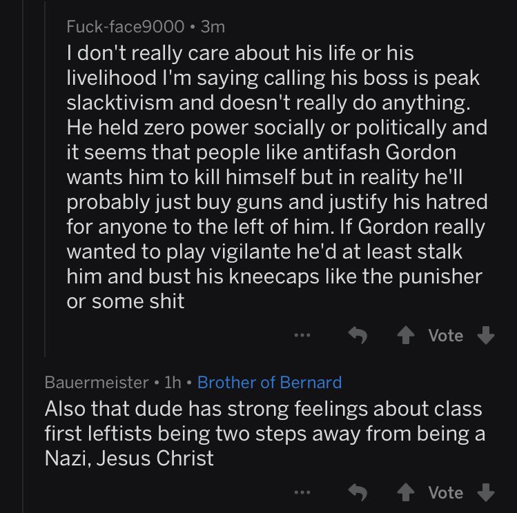 Is this from one of the Chapo guys then? I only listen to them occasionally so I don't know what they think about outing fascists. Regardless, comparing it to stalking is dumb. Nazis already have all the excuses they need to use violence.