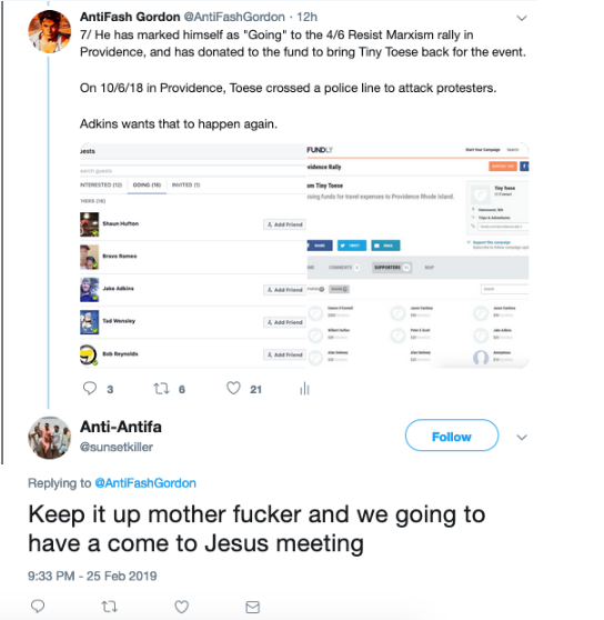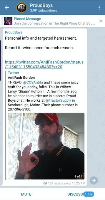 4/ Hufton was part of the Proud Boys/Resist Marxism group that planned a rally in Providence for 4/6. In the chats, the group traded photos of leftist activists they planned to attack at the rally, and traded photos of weapons they planned to bring.https://www.huffpost.com/entry/proud-boys-chat-logs-premeditate-rally-violence-in-leaked-chats_n_5ce1e231e4b00e035b928683 …