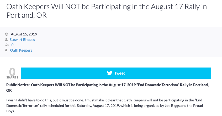 Oath Keepers are bailing on Proud Boy Joe Biggs' 8/17 rally in Portland. Why? "We have not seen adequate steps taken by the organizers to exclude known or suspected white nationalists from attending this event."pic.twitter.com/YttRUbilAr