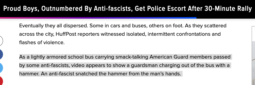 Andy Ngo claimed that antifascists attacked a bus with a hammer. Turns out, the hammer was taken from a member of the American Guard, a hate group, who tried to charge out of the bus to attack antifascist protesters.https://twitter.com/RespectableLaw/status/1162972206147743744 …