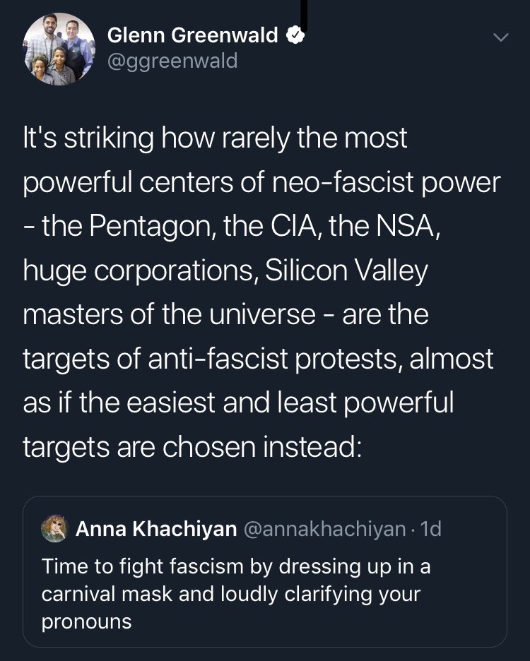 It's striking how rarely the most powerful centers of neo-fascist power - the Pentagon, the CIA, the NSA, huge corporations, Silicon Valley masters of the universe - are the targets of anti-fascist protests, almost as if the easiest and least powerful targets are chosen instead:https://twitter.com/annakhachiyan/status/1162867254792531968 …