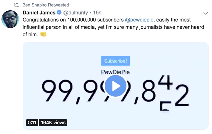 nothing to see here, just Ben “how dare you call me a Nazi” Shapiro celebrating the milestones of Nazi-adjacent PewDiePiehttps://twitter.com/elivalley/status/1165682850395492352 …
