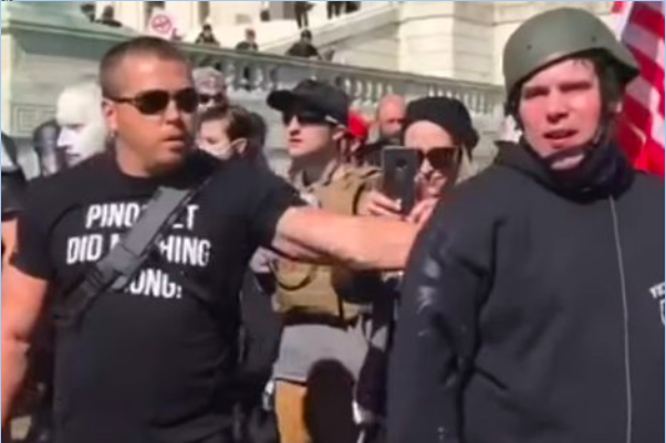 12/ Photos of Proud Boy/American Guard member Dane Menough wearing a "Pinochet Did Nothing Wrong" shirt in Providence on October 6, 2018, when the groups crossed a police line to attack protesters at a Resist Marxism rally.pic.twitter.com/hR7sjyUQwb