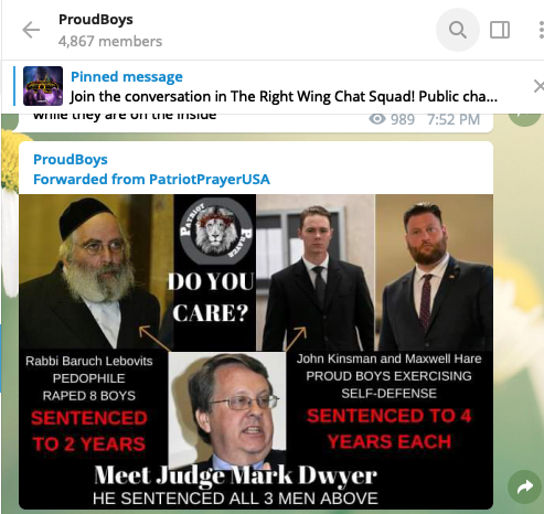 6/ Yet the Proud Boys only seem to care when the perpetrator is Jewish. This screenshot is from the Proud Boys' official Telegram channel. They're talking about how the judge who sentenced Hare and Kinsman only gave 18 months to a "Jewish pedophile."pic.twitter.com/fkE5n6Evfw