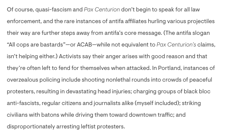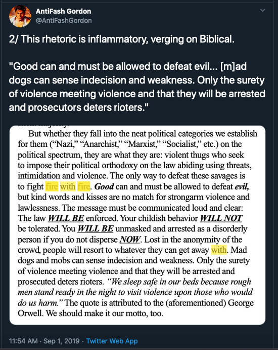 Saying that confronting the police "steps away from antifa's core message" and saying that an anti-police slogan "isn't helping either" seems to me like you're trying to co-opt an anti-authoritarian movement to be more police friendly? And that's some bootlicker shit, dude.pic.twitter.com/v8SRyIykNz