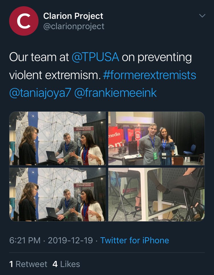 I need to wind this thread down (for today), but I'd be remiss if I didn't point out that Frank Meeink spent all day repping hate group the Clarion Project at the Turning Point USA conference today. https://twitter.com/agtbloodrayne/status/1207854353610088449 … h/t @agtbloodrayne