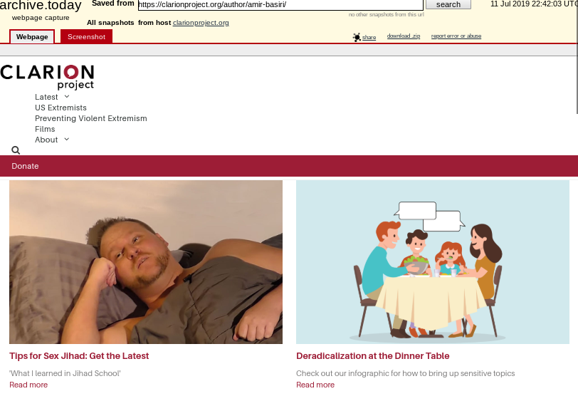 (You can see in the archive that these articles -- including one about "sex jihad" -- are listed under his byline, but the link to the current site says the article was authored by "Clarion Project", not him. Kinda weird, guys.)pic.twitter.com/6zMjXzkrPG