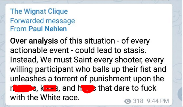 4/ Paul Nehlen is a former GOP Congressional primary candidate who has since become an advocate for mass shootings. On Telegram, Nehlen tells his followers to “Saint ever shooter” to encourage mass violence.pic.twitter.com/dcgdRNrMdU