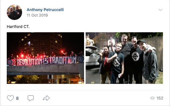 4/ Petruccelli has ties to the neo-Nazi Patriot Front, with whom he did a banner drop in Hartford, CT. Patriot Front is an offshoot of Vanguard America, the group James Fields marched with at Unite the Right in 2017, before he drove a car into a crowd, murdering Heather Heyer.pic.twitter.com/VJb2rE22RD
