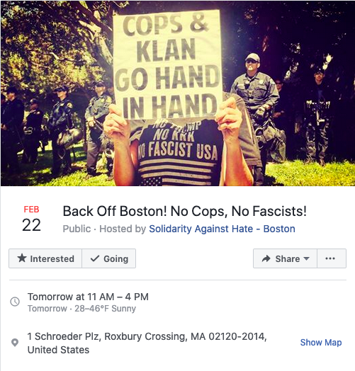 15/ We can beat back the rise of American fascism, and we don't need the cops or the courts to do it. They won't protect us. But we need your help. Come to counter-protest tomorrow at 11:00 am at 1 Schroeder Plz, Roxbury Crossing, MA. Details are here: https://www.facebook.com/events/1040880616281293/ …pic.twitter.com/LI6Z83FI8l