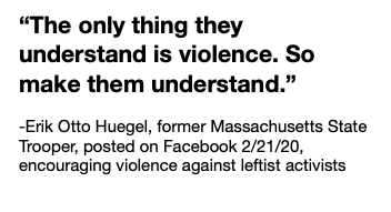 1/ Former @MassStatePolice Officer Erik Otto Huegel is on Mark Sahady's Facebook page, threatening violence against leftists at tomorrow's Super Happy Fun America pro-police rally. Join us to counterprotest fascists and the police at 11 am, 1 Schroeder Plz, Roxbury Crossing, MA. pic.twitter.com/hCP0oqClVw