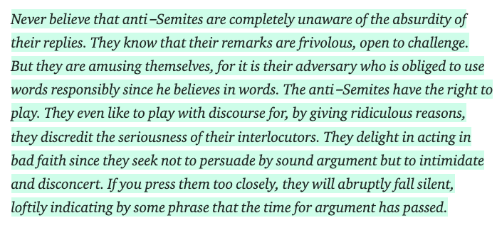 I've always found the following Sartre passage, from "Antisemite and Jew," to be a useful thing to keep in mind when dealing with fascists.