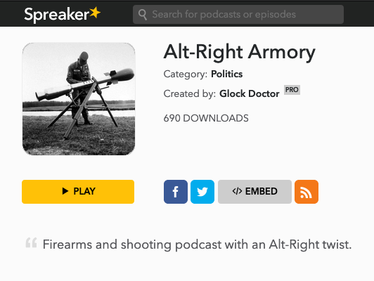 @Spreaker, where he spends hours talking about the guns he owns, how he loves being a racist, and various far-right conspiracy theories.pic.twitter.com/sZbne2NEAL