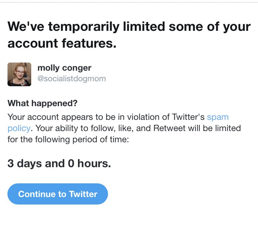 I know that fucking screen way too much. Is it possible that she got mass reported? I don't think it's possible for spamming, but I also have 0 trust in Twitter enforcing their TOS the way they're supposed to.