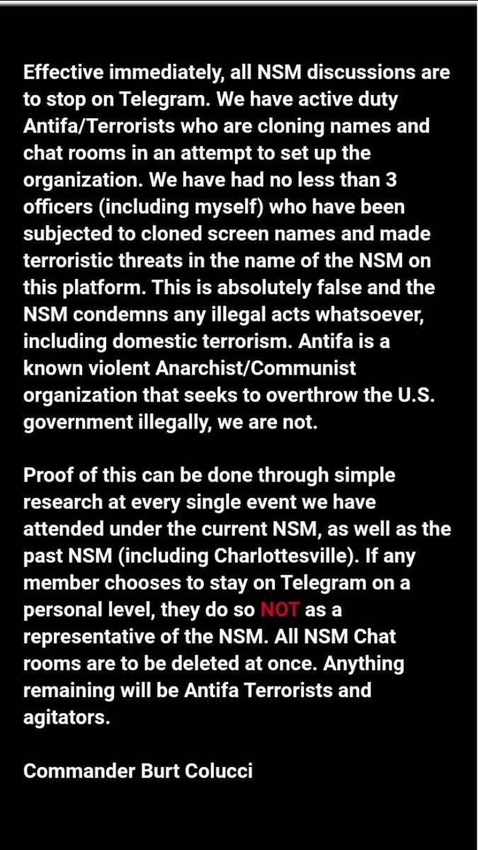 Neo-Nazi National Socialist Movement Commander Burt Colucci just deplatformed himself and all NSM Telegram chats, then ran away crying about it.