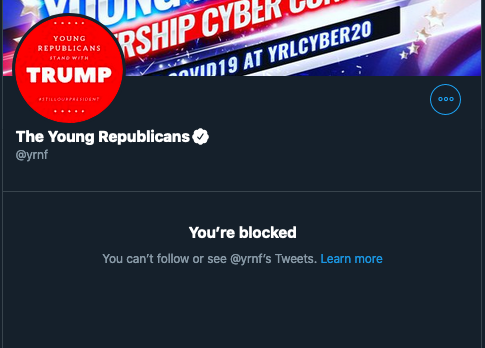 You know, you point out that the Chair of the @yrnf Association of Young Republican Clubs has a bunch of ties to violent hate groups, and the Young Republicans block you. DEBATE ME, COWARDS 🤣 https://twitter.com/NYCAntifa/status/1243956525300944897 …pic.twitter.com/cASkubfEhp
