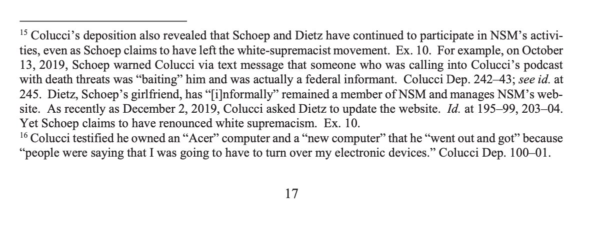 4/ They also claim that former NSM leader Jeff Schoep is reformed. However, Schoep has consistently refused to produce evidence demanded by the court in Sines v. Kessler, claims, and claims he still has "some issues with the Jewish Question."https://twitter.com/TTOJAF/status/1166650445546307584 …