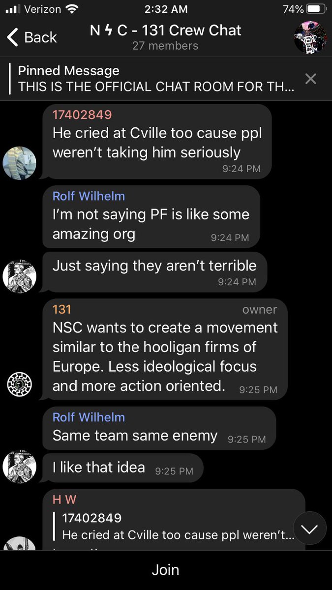 3/ And in their Telegram chats, Chris Hood, using the handle "131," states that he wants the group to be "similar to the hooligan firms of Europe. Less ideological focus and more action oriented [sic]."pic.twitter.com/FwQNbfa1Rg