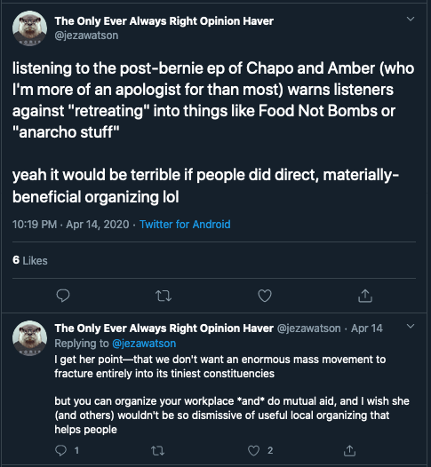 Chapo Trap House and Jacobin coming for Food not Bombs during a pandemic, as FnB is working overtime trying to keep people cut off from their usual food assistance from starving, is just irresponsible to the point of being sociopathic.