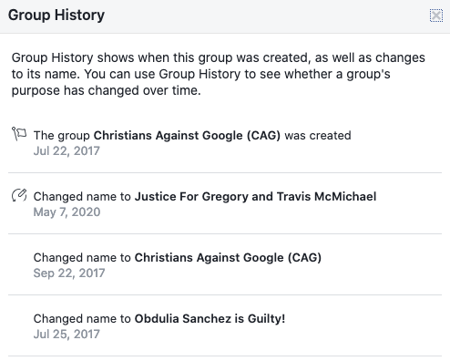 Interesting. The group started as "Christians Against Google" before changing its name to "Obdulia Sanchez is Guilty!," then becoming "Justice For Gregory and Travis McMichael." Looks like a some grifters trying to assemble a bunch of marks, not caring if they spread hate.pic.twitter.com/iXgn35mMMU