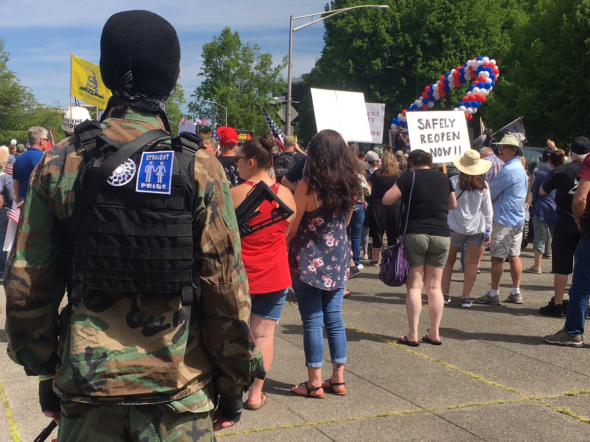 At a Reopen protest in Olympia, WA, an attendee is dressed in fleck and a plate carrier, patches read "Straight Pride," and feature a Sonnenrad, an occult symbol of Nazi Germany. "Straight Pride trolls" are just Nazis by another name, with the same violent fantasies.https://twitter.com/OlympiaJoe/status/1259196144531279878 …