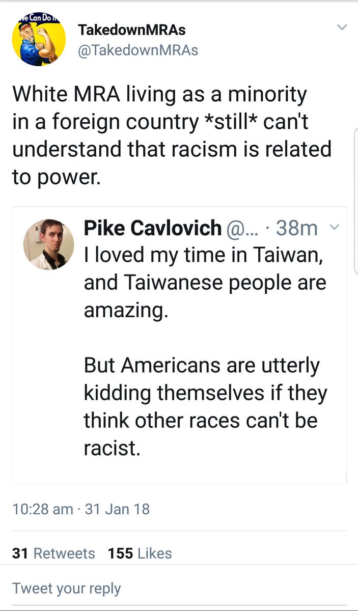 The admin of a known anti male activist page 'Takedown MRA' proves in this tweet, that he/she refuses to accept or understand racism. I guess sexism isn't the only thing this bigot is guilty of. https://twitter.com/AntiMaleExposed/status/959421573173252096/photo/1pic.twitter.com/7ThEh7FCW7 pic.twitter.com/g2Sb8wtUO6