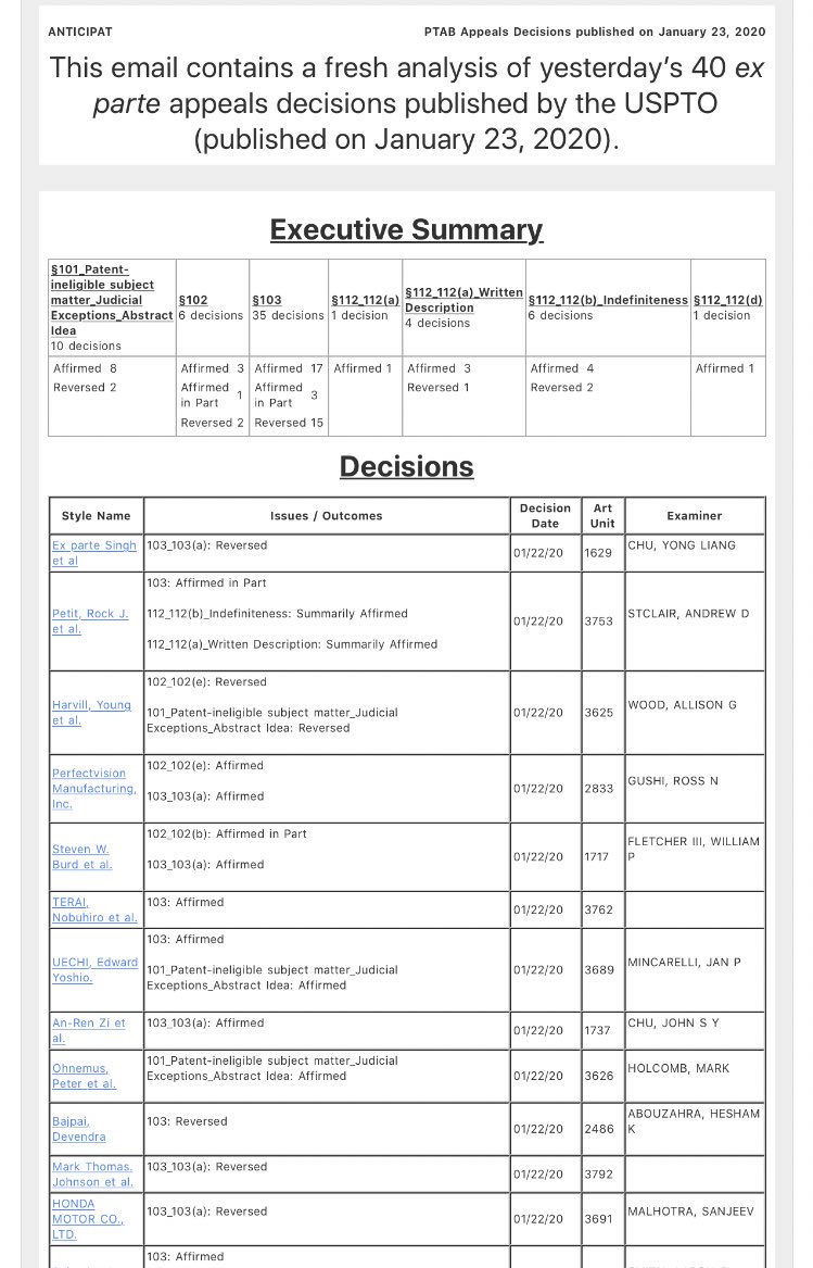 Yesterday, the USPTO published ex parte PTAB decisions. Here’s the fresh recap of what these decisions look like. Get this free recap of PTAB decisions delivered straight to your inbox: https://anticipat.com/accounts/signup/recap/ …pic.twitter.com/Fjy1EjbO8r