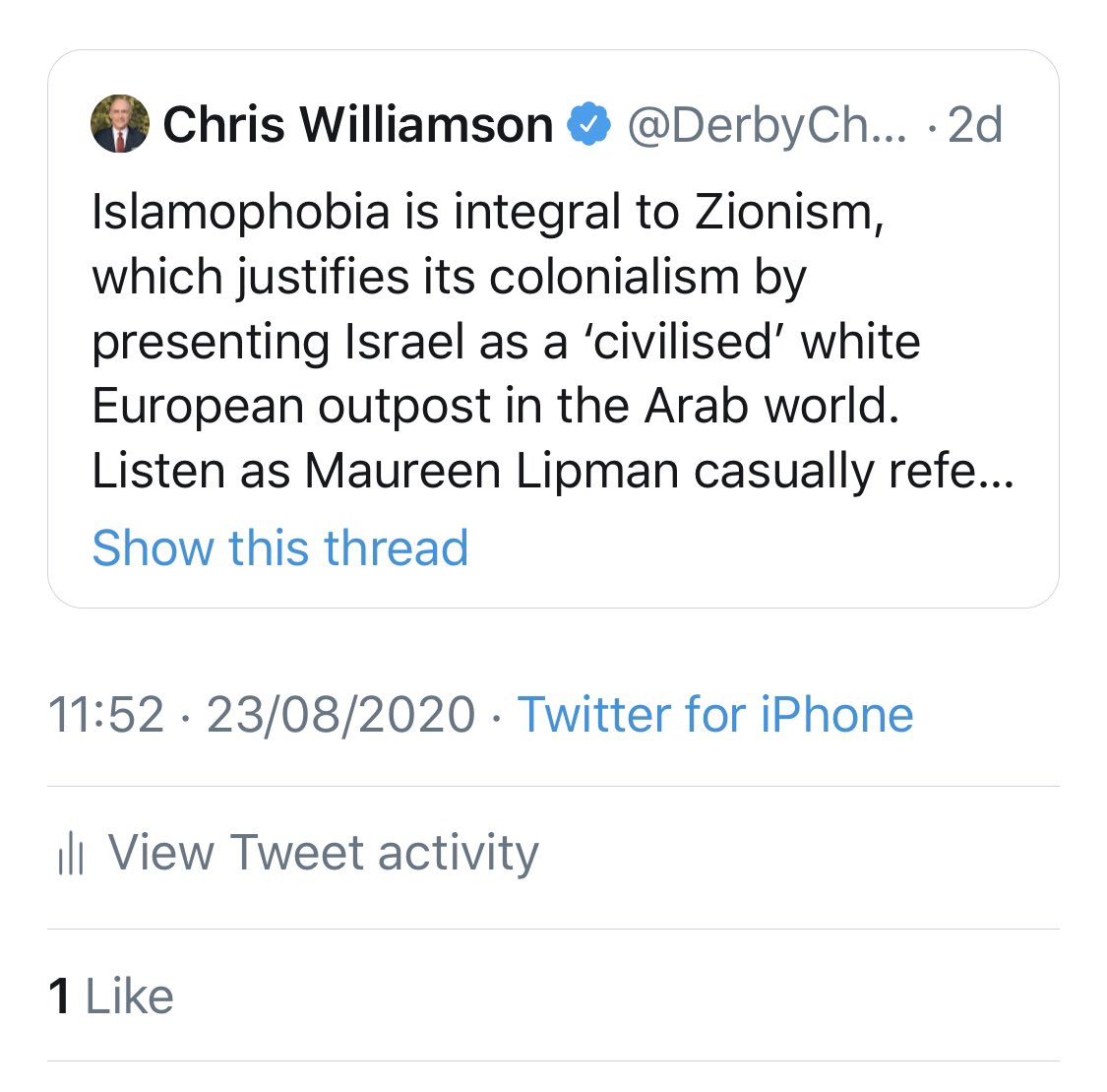 We missed this vile tweet full of lies racism and self hatred https://twitter.com/DerbyChrisW/status/1296534638152884233 …