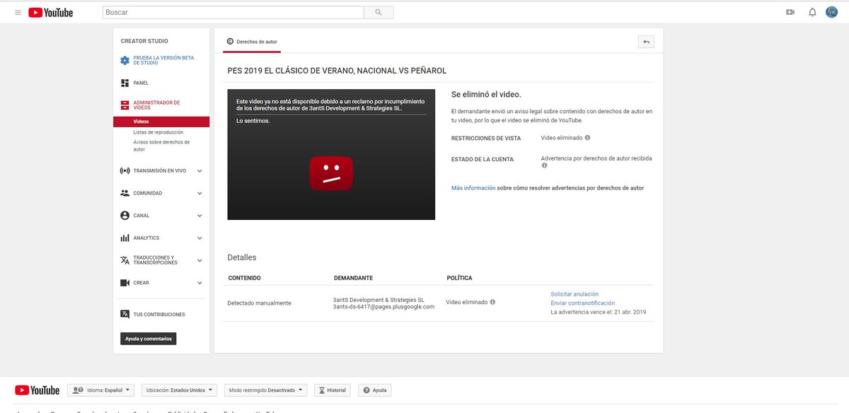 A lo que ha llegado Youtube!, me borraron un streaming de PES 2019, jugando Nacional vs Peñarol, y para colmo me pusieron un strike. Hijos de puta. Ni siquiera subí algo de Tenfield, no puede ser.pic.twitter.com/NUu2Tn7ZTw