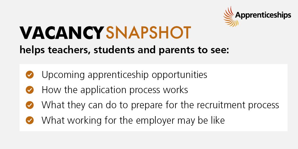 #Teachers, inspire your students by using Vacancy Snapshot to showcase the incredible#apprenticeship opportunities available to them! With recruitment info, hints & tips and much more, visit today.. https://tinyurl.com/yarvsmxt pic.twitter.com/sghevH0Hgz