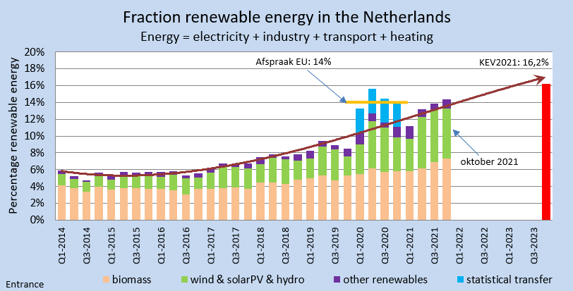 In oktober kwam ruim 14% van alle NL energie uit hernieuwbare bronnen. Prima op het spoor richting 16% in 2023, zoals destijds afgesproken in het Energieakkoord. [Energie = elektriciteit + warmte + industrie + transport]