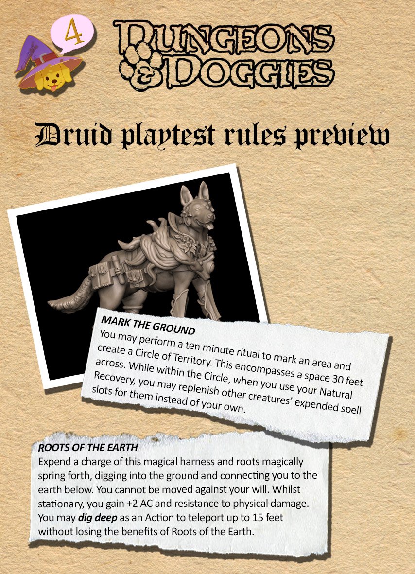 #dungeonsanddoggies#dnd kickstarter launch! Today we have a peek at some playtest rules for Freya, and all Canine Druids! These excerpts show a Canine Druid ability and one of the Magic Items avaialble to doggy druids! More tomorrow!