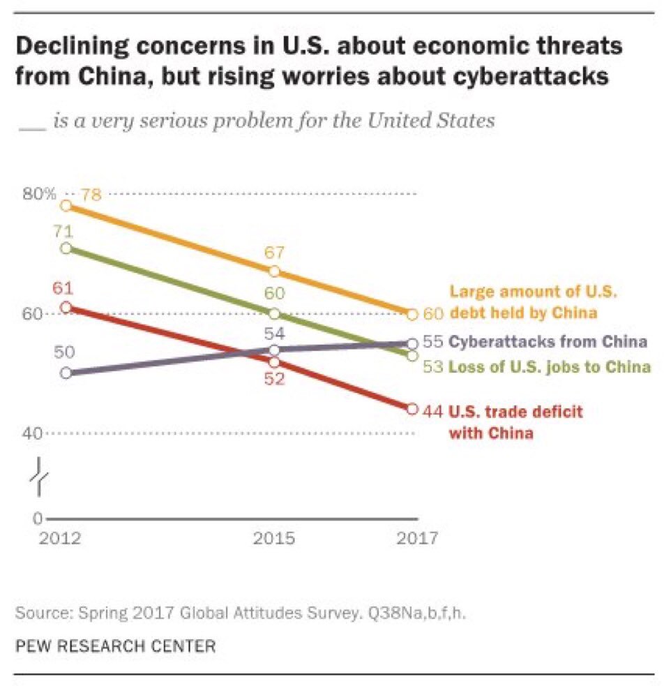 Ahead f Xi visit 2 US @pewresearch shows less Americans worried abt trade deficit & more concerned abt #cyberattacks http://www.pewglobal.org/2017/04/04/americans-views-of-china-improve-as-economic-concerns-ease/ …pic.twitter.com/y2JaEeR1OU