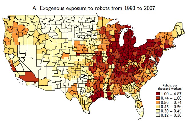 Acemoglu: 1 extra robot/1000 workers drops jobs/pop by 0.18 p.p. &wages by 0.25% http://bit.ly/2ohX9nU  @mitecon @voxeu @johnvanreenen pic.twitter.com/cqlEPq3pv2