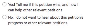 Hey @Change why don't you let users choose to hear if the petition they sign wins without automatically signing them up for emails about *other* petitions? Control over your data shouldn't mean all in or all out.pic.twitter.com/tQy93omFJE